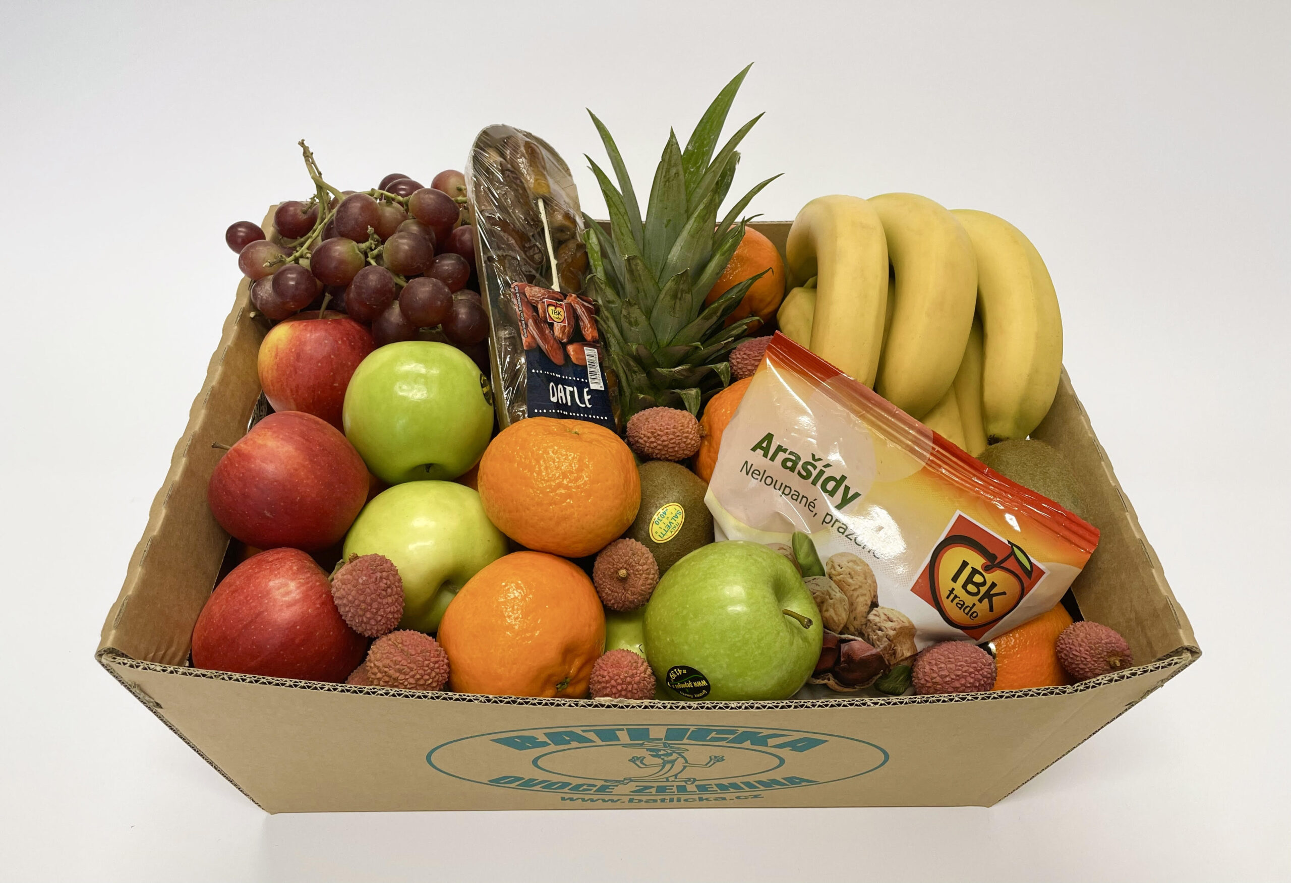 Může obsahovat: Ananas, Banány, Mandarinky, Pomeranče, Jablka, Hroznové víno, Physalis, Kiwi, Sušené plody, Arašídy